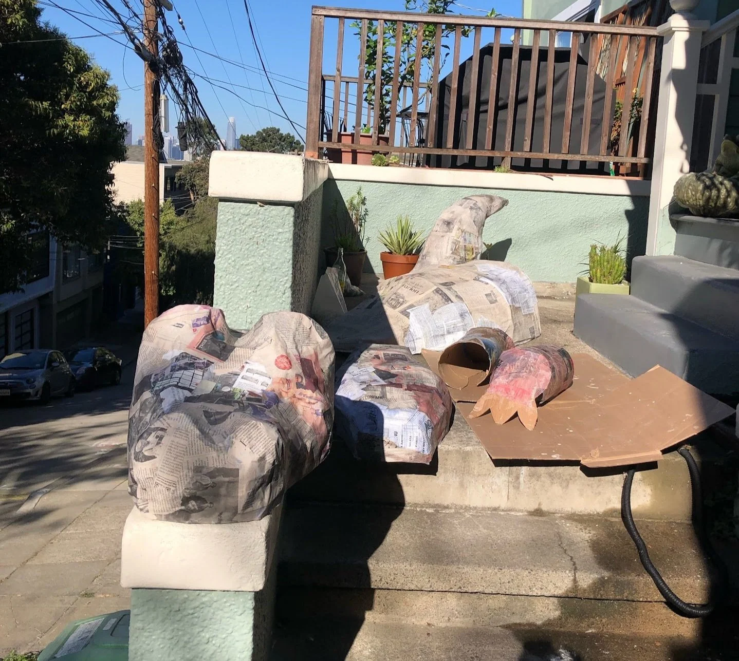 Generally, I am pretty fixated on “swamp stuff” and the alligator is the ultimate mascot for such a theme. Because SF was still in full shelter-in-place/social-distancing mode, I had the idea to create a Halloween candy dispenser/distributor that met social and safety requirements of the time. Thus, the life-size papier maché alligator was born.